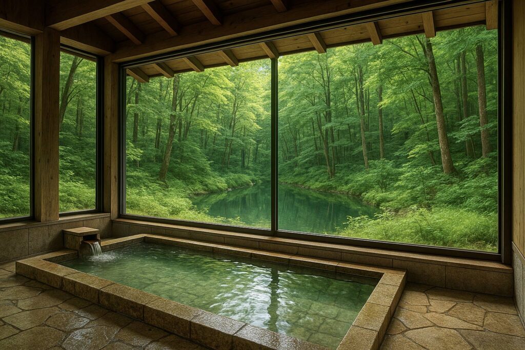 辺久町東部の深い森に佇む源泉かけ流しの温泉施設。アルカリ性単純泉は肌当たりがやわらかく、入浴後はしっとりすべすべに。大きなガラス窓越しに四季折々の緑を望める露天風呂が自慢です。内湯には寝湯やジェットバスもあり、疲れた身体を多角的に癒します。木の香りと鳥のさえずりに包まれながら、心ゆくまでリラックスしてください。