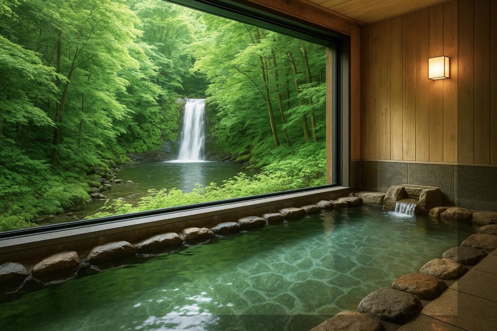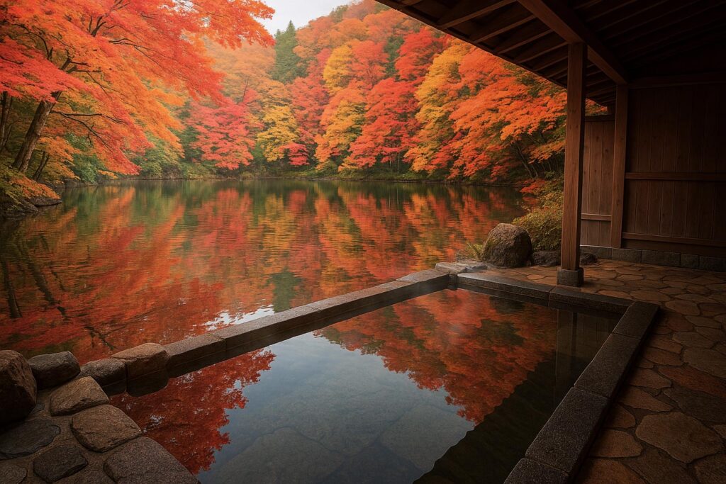微硫黄泉特有のやさしい香りと、やや高めの湯温 (42℃前後) が特徴で、冷え性や筋肉疲労の回復に効果的。露天風呂からは湖面に映る山並みや紅葉を「水鏡」のように眺められ、静寂と湯気が織りなす幻想的な景観が魅力です。浴場内の休憩スペースからも湖畔の風景を一望でき、ゆったりとくつろげます。夕暮れ時には照明に照らされた水面がきらめき、夜間は満天の星空を眺めながら入浴が可能です。